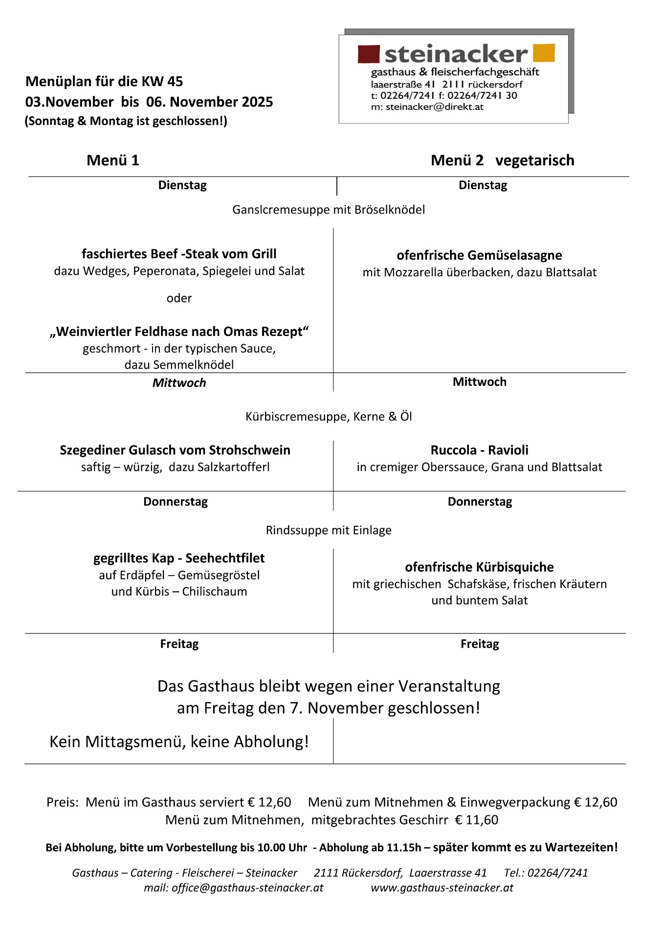 Mittagsmenü zum Abholen bei mitgebrachten Geschirr Preis € 11,60